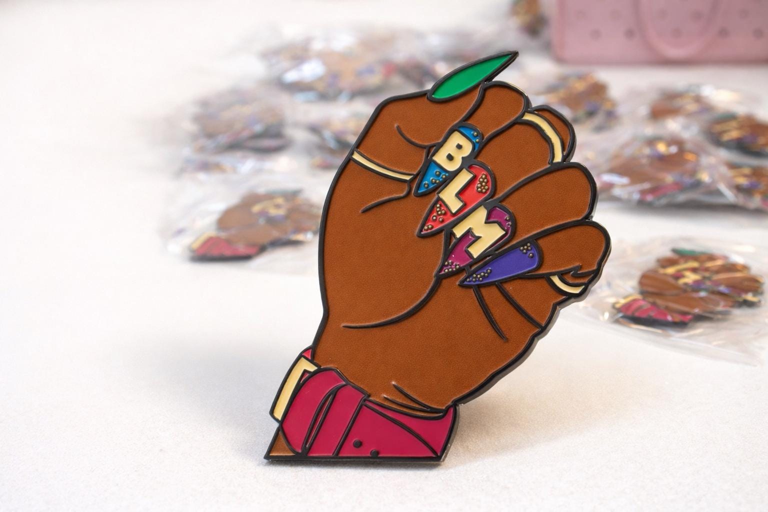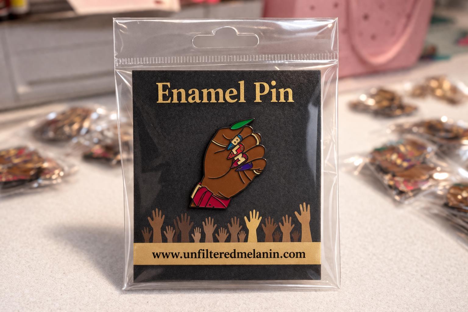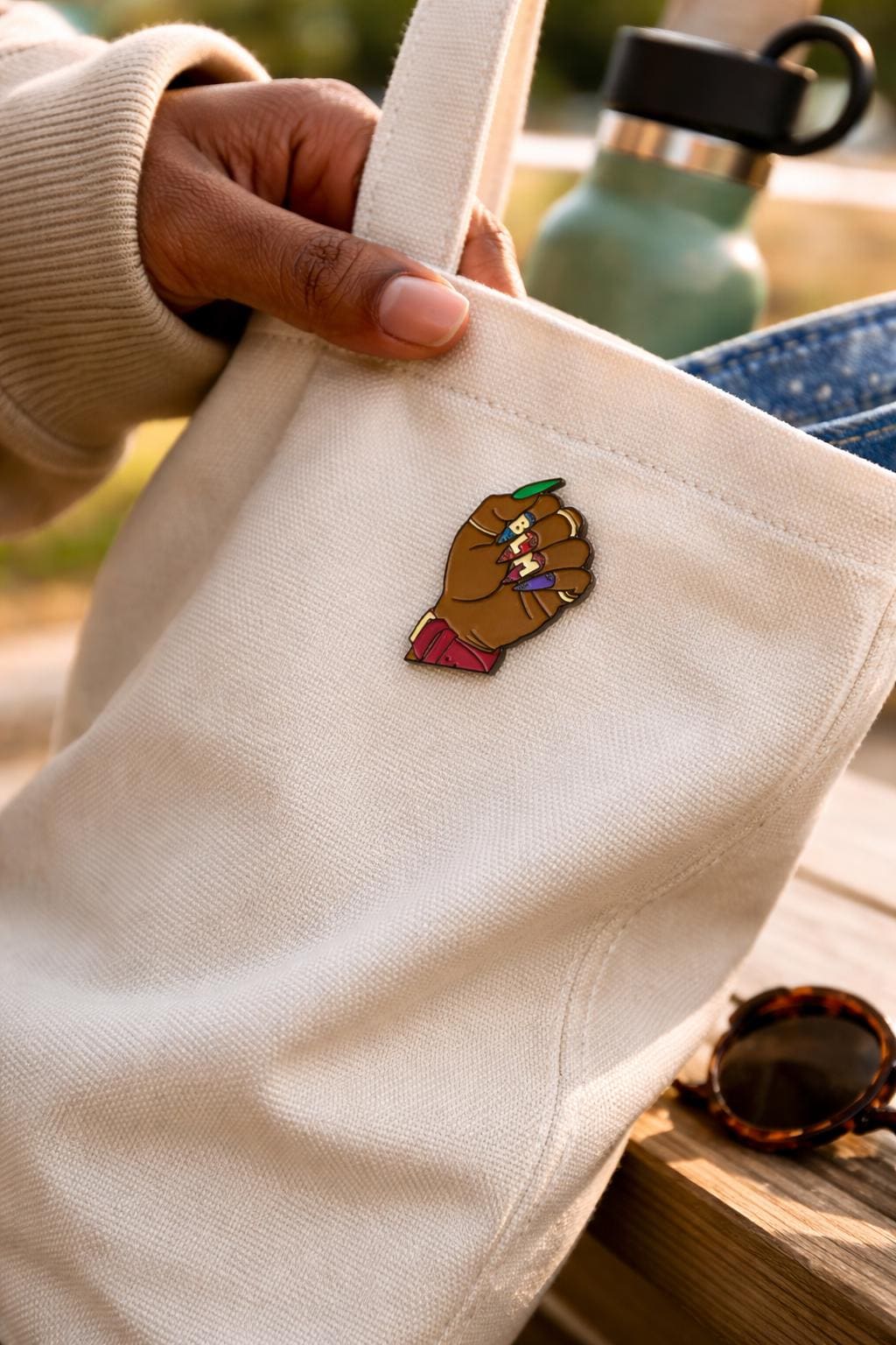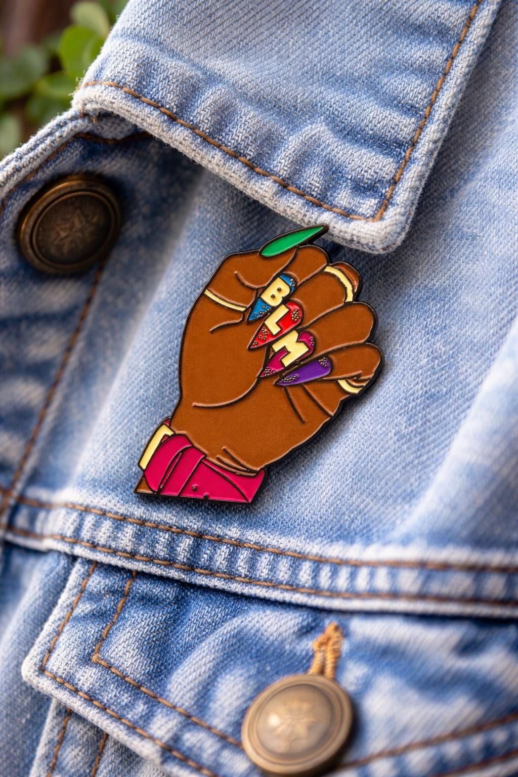 This 1.75-inch metal enamel pin features a powerful raised fist with vibrant, detailed acrylic nails spelling BLM — a symbol of strength, culture, resistance, and pride. Designed with rich brown tones, glossy enamel details, and gold accents, this piece stands out on jackets, totes, backpacks, hats, and lanyards.