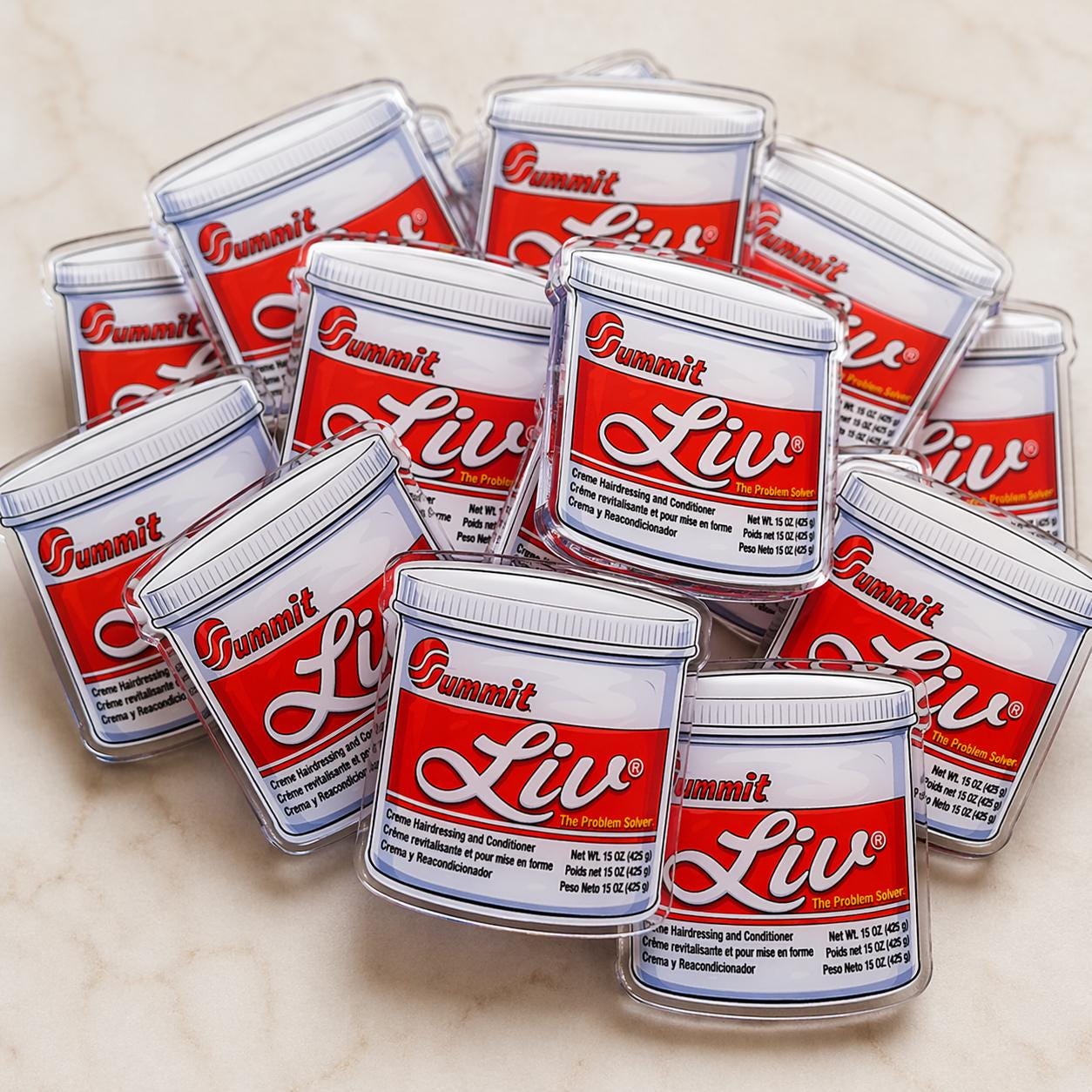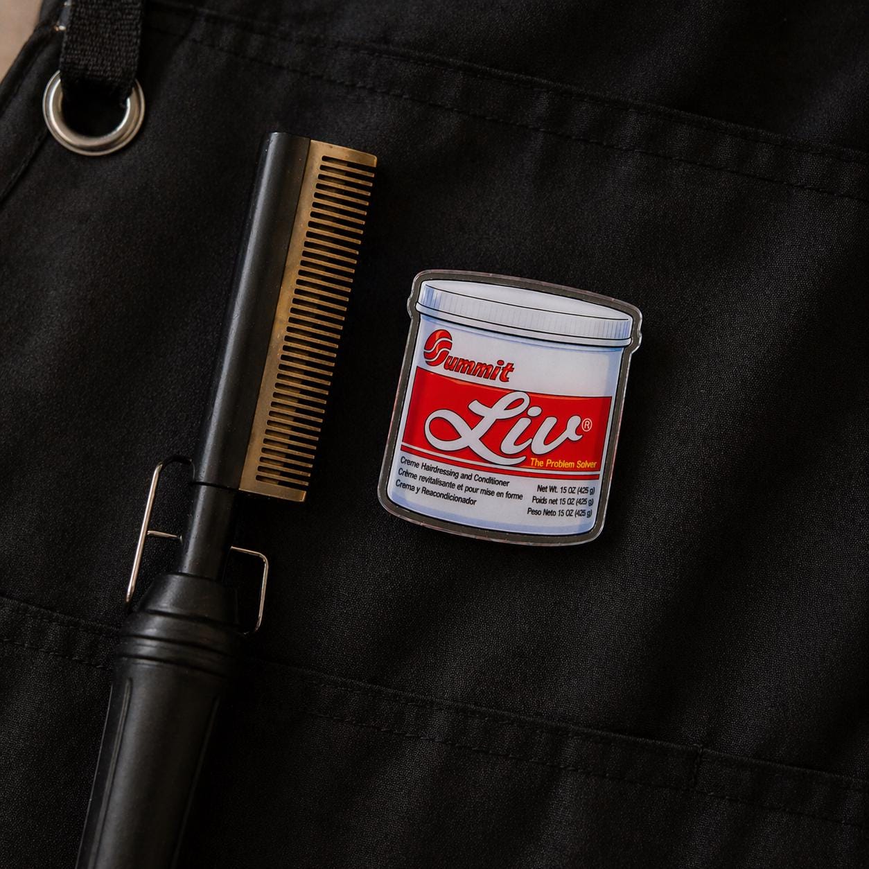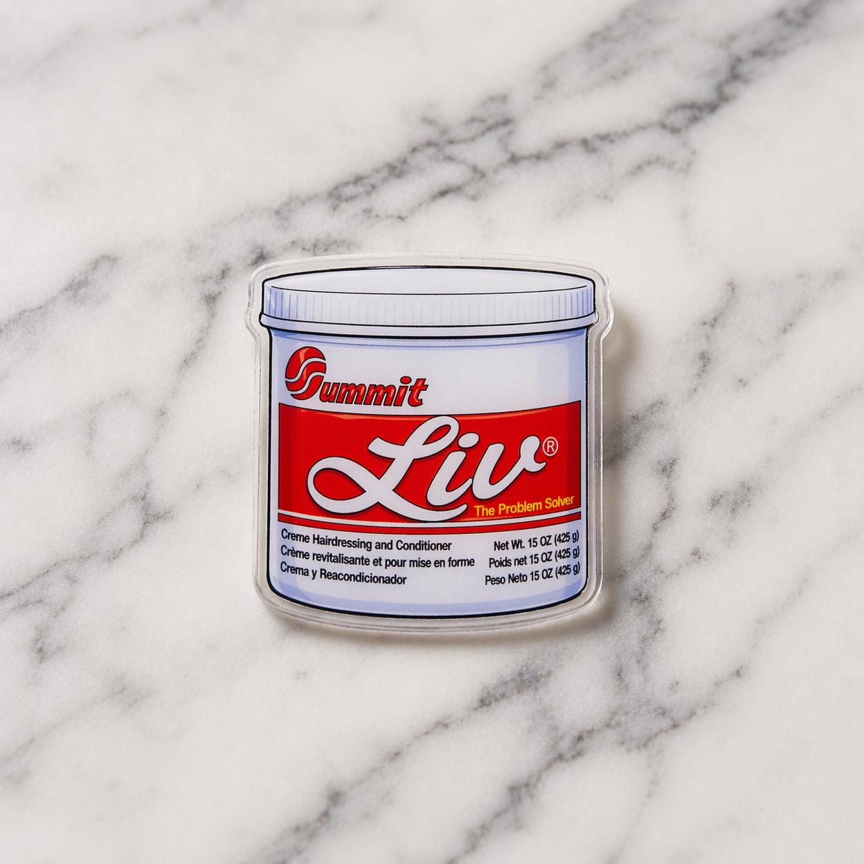 Bring back the beauty supply store memories with this bold 1.5 inch acrylic pin inspired by the iconic Summit Liv jar. A playful nod to classic hair care culture, this glossy statement pin is perfect for anyone who knows the vibes. Lightweight, durable, and full of nostalgia, it’s the perfect accessory to add personality to your tote bag, denim jacket, backpack, hat, or pin collection.
