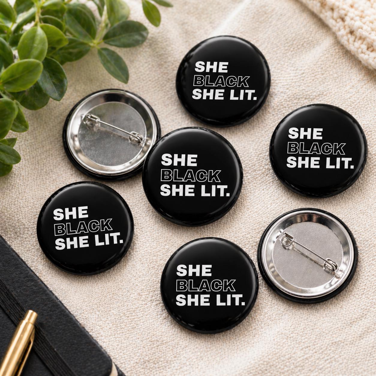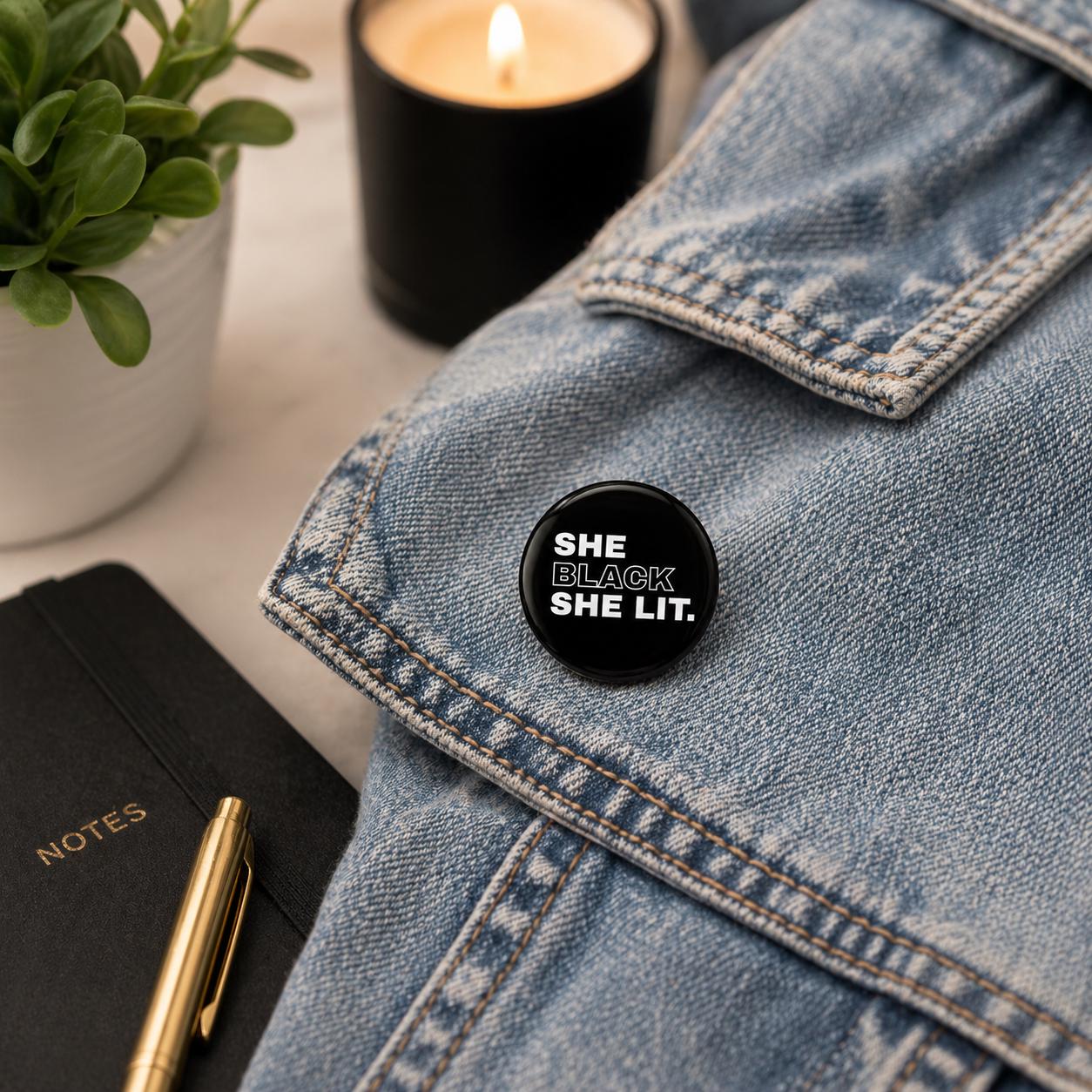 She Black She Lit Pin Button | 1.5 Inch Black Girl Statement Pin | Melanin Gift | Funny Black Culture Button | Tote Bag Jacket Accessory