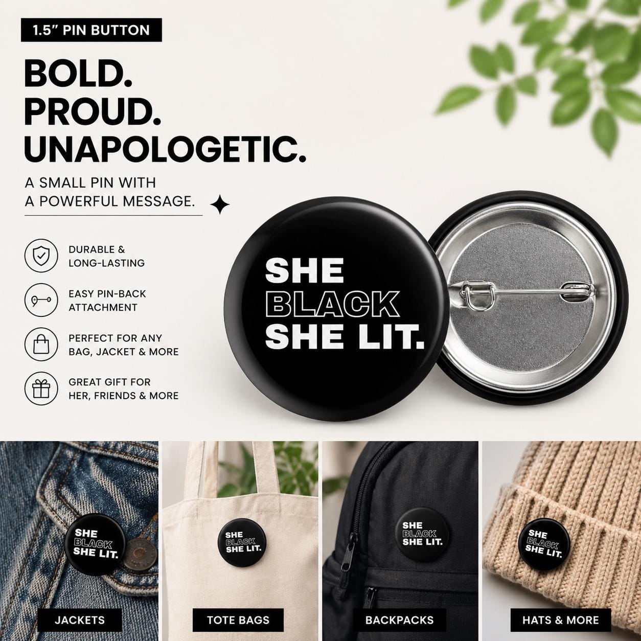 Bold, unapologetic, and full of energy—this “She Black She Lit.” button says it all. Designed for the girls who shine naturally, this statement pin blends confidence, culture, and style into one must-have accessory.