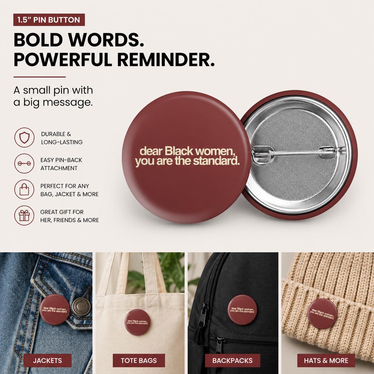 A reminder worth wearing. This “Dear Black Women, You Are the Standard.” button is a bold affirmation made to celebrate beauty, excellence, confidence, and the unmatched standard Black women set every day.